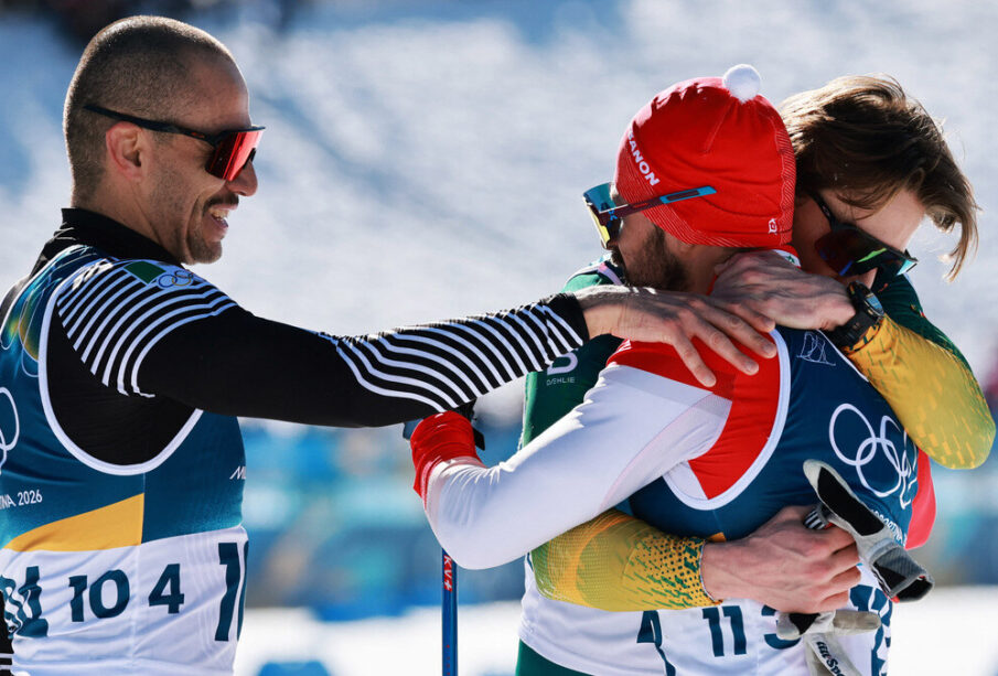 Milano Cortina 2026 Olympics - Cross-Country Skiing - Men's 10km Interval Start Free - Tesero Cross-Country Skiing Stadium, Lago, Italy - February 13, 2026. Matthew Smith of South Africa, Allan Corona of Mexico and Samer Tawk of Lebanon react after finishing REUTERS/Stephanie Lecocq