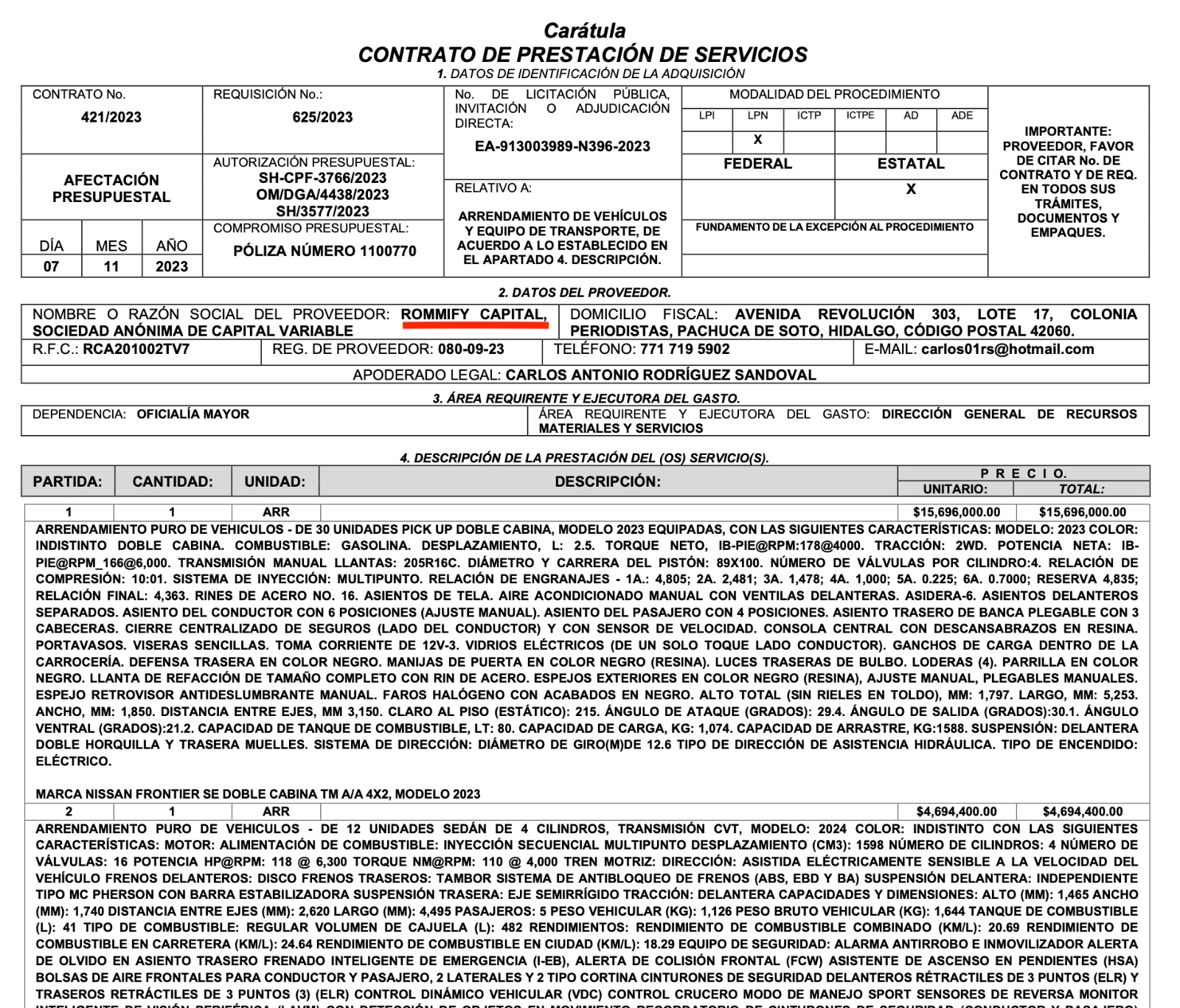 La otra propuesta fue presentada por la citada Rommify Capital SA de CV, empresa hidalguense con domicilio en Zona Plateada, Pachuca de Soto, y que tiene un amplio historial de contratos recientes en Hidalgo con Oficialía Mayor, DIF estatal, STCH y municipios.