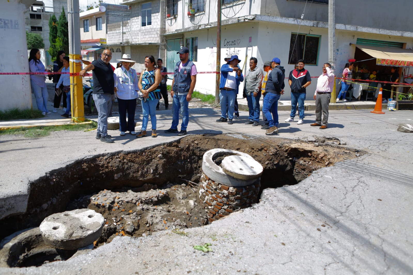 La alcaldesa Azucena Cisneros Coss supervisó las obras para rehabilitar el socavón, localizado en avenida Central a la altura de calle Arboledas, en dicha comunidad, en el cual cayeron varios vehículos.