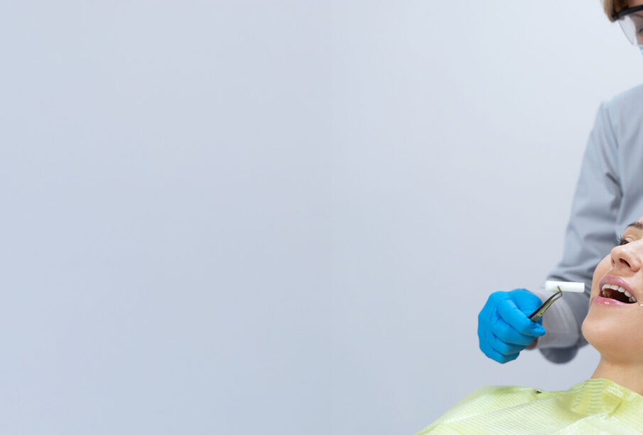 Side view of doctor treating patients teeth using dental instruments. Oral medicine. Stomatology concept. Braces installation procedure. Teeth implantation process