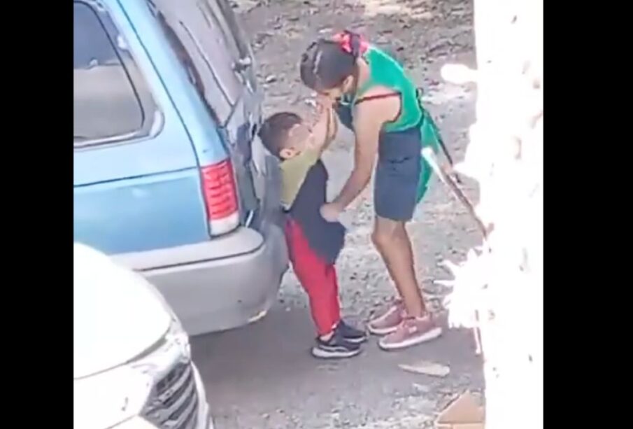 A través de redes sociales fue difundido el momento en que la joven de 21 años, identificada como “Rosalinda N”, golpea al menor detrás de una camioneta. En todo momento, la mujer voltea para ver si nadie la observa, aunque no se percata que está siendo grabada desde la altura.
