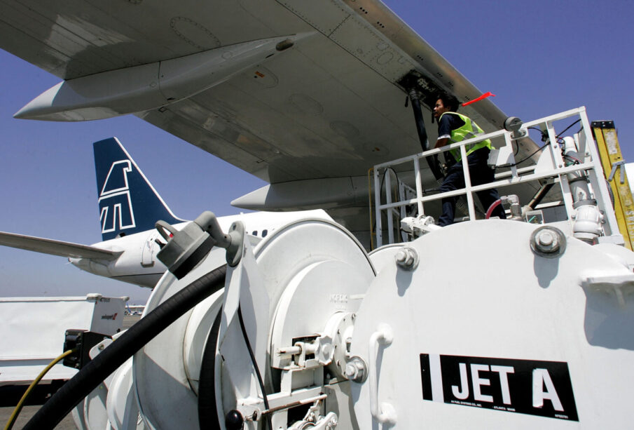Swissport fueler Sok Teng monitors a fuel line while filling a Mexicana plane at the Oakland International Airport 12 August, 2005 in Oakland, California. Northwest Airlines, American Airlines and Jet Blue all hiked fares on select routes on Friday in order to mitigate the impact of recent fuel shortages and the rapidly rising fuel costs as crude oil futures reached over $67 a barrel on Friday. The airline industry has been struggling to contain surging fuel costs, which have overtaken labor costs as the biggest expense for some airlines. Justin Sullivan/Getty Images/AFP FOR NEWSPAPERS AND TV USE ONLY (Photo by Justin Sullivan / Getty Images North America / Getty Images via AFP)