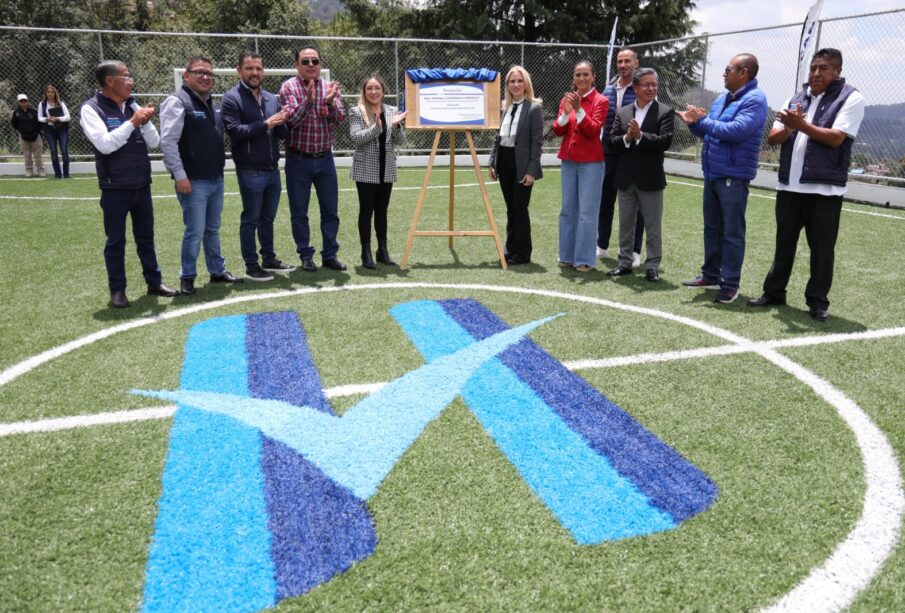 La presidenta municipal, Romina Contreras, inauguró la cancha de futbol rápido del CBT en Santa Cruz Ayotuxco, con la finalidad de fomentar hábitos saludables entre los jóvenes