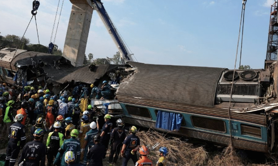 Grúa cae sobre tren en Tailandia, hay 32 muertos y decenas de heridos