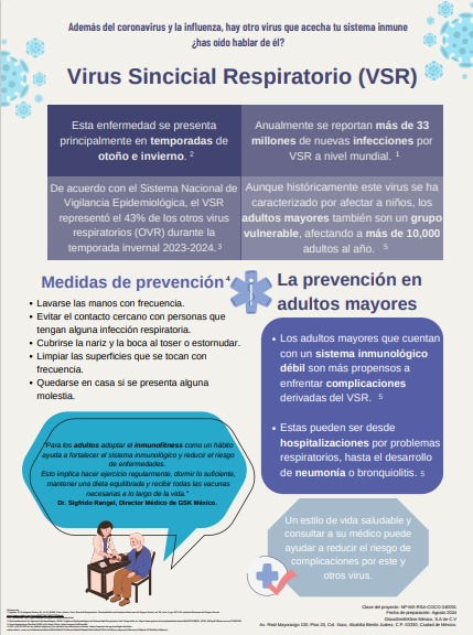Los adultos mayores, cuentan con mayor riesgo de sufrir infecciones graves con el VSR, así como complicaciones que van desde una hospitalización por problemas respiratorios, a la detonación de una neumonía o bronquiolitis.