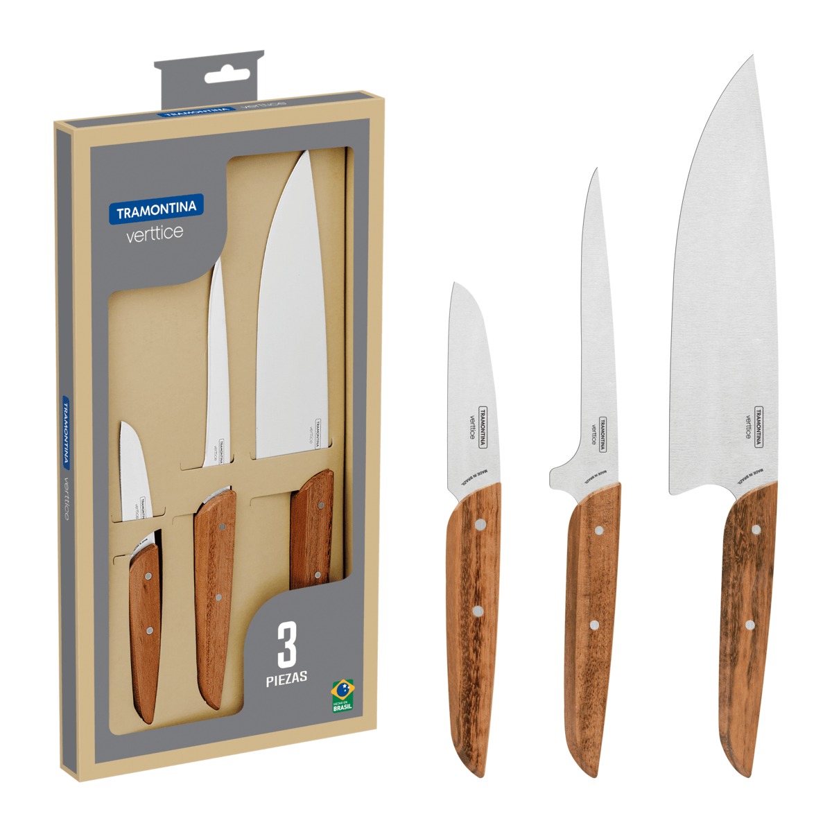 - Juego de cuchillos Verttice con mangos de madera natural, 3 piezas Fabricados con lámina de acero inoxidable, sus piezas disponen de un excelente poder de corte y son altamente durables. Los mangos de madera natural con remaches de acero inoxidable son más resistentes y aportan un aspecto rústico y lleno de estilo.