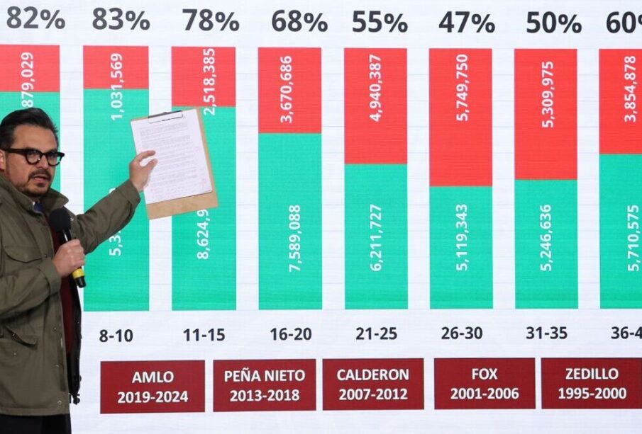 CIUDAD DE MÉXICO, 11FEBRERO2026.- Zoé Robledo, titular del Instituto Mexicano del Seguro Social (IMSS), muestra una gráfica sobre vacunación durante la conferencia Mañanera del Pueblo en la que se informó sobre los casos de Sarampión en el país, así cómo la estrategia nacional para su prevención. FOTO: GALO CAÑAS/CUARTOSCURO.COM