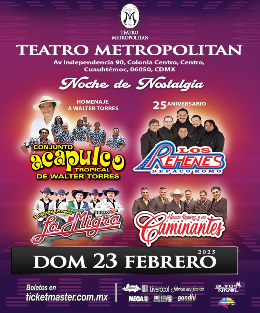El próximo domingo 23 de febrero de 2025, a las 18:00 horas, el emblemático Teatro Metropólitan de la Ciudad de México será el escenario de un evento sin precedentes: “Noche de Nostalgia”, una celebración que reunirá a íconos de la música grupera para rendir homenaje a sus trayectorias y al legado de este género que ha marcado a generaciones enteras. De este modo, el Conjunto Acapulco Tropical de Walter Torres le rendirán un homenaje a su fundador, mientras que Los Rehenes de Paco Romo celebrarán su 25 aniversario, además, la Migra y Los Caminantes de Horacio Ramírez se unen en una noche especial. Los boletos están disponibles a través del sistema Ticketmaster y en las taquillas del recinto.